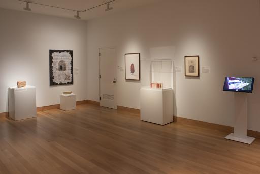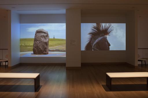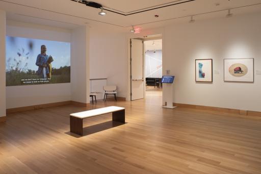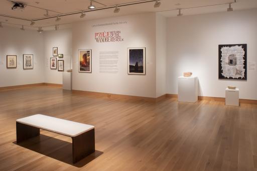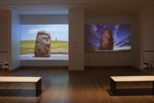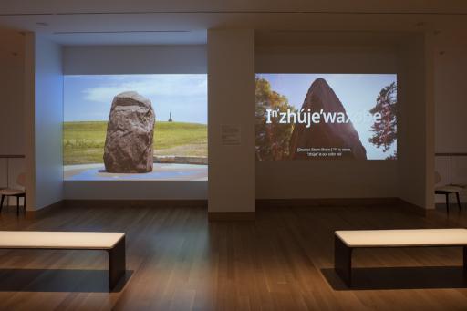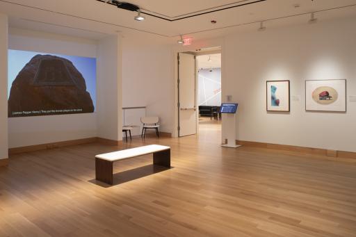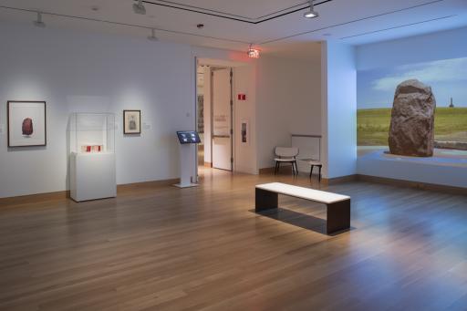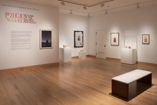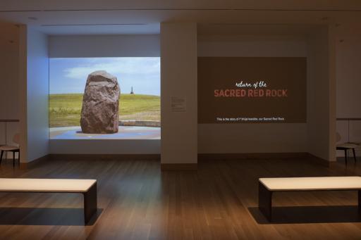 This exhibition tells the story of the rematriation of Iⁿ‘zhúje‘waxóbe, or the Sacred Red Rock, from the City of Lawrence, Kansas, to Kaw Nation through artwork created by local artists and Kaw tribal citizens. The Sacred Red Rock is a 28-ton red Siouxan quartzite boulder that holds immense cultural and spiritual significance for the Kanza people of the Kaw Nation. The Rock originally sat at the confluence of the Kaw River and Shunganunga Creek near Tecumseh, Kansas, after being deposited by glaciers. When the U.S. government forced the Kanza off their land in 1873, they were separated from the Sacred Red Rock. In 1929, the boulder was taken and moved to Lawrence, Kansas, as part of the city’s 75th-anniversary celebration and remained there for nearly 100 years. While efforts to rematriate Iⁿ‘zhúje‘waxóbe go back to the 1990s, it wasn’t until 2021 that the Lawrence City Commission voted unanimously to issue a formal apology to Kaw Nation and assist with the return. In June of 2024, the project celebrated the rematriation of the Sacred Red Rock in its new home at Allegawaho Memorial Heritage Park, which is on land owned by Kaw Nation near Council Grove, Kansas. Sacred Red Rock is curated by Sydney Pursel alongside an advisory committee of Kaw Nation citizens.