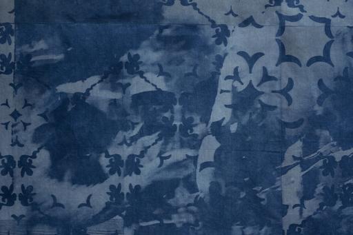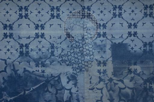 Material/technique: hand-dyed cotton fabric; hand-dyed linen; indigo dye; embroidering; beading